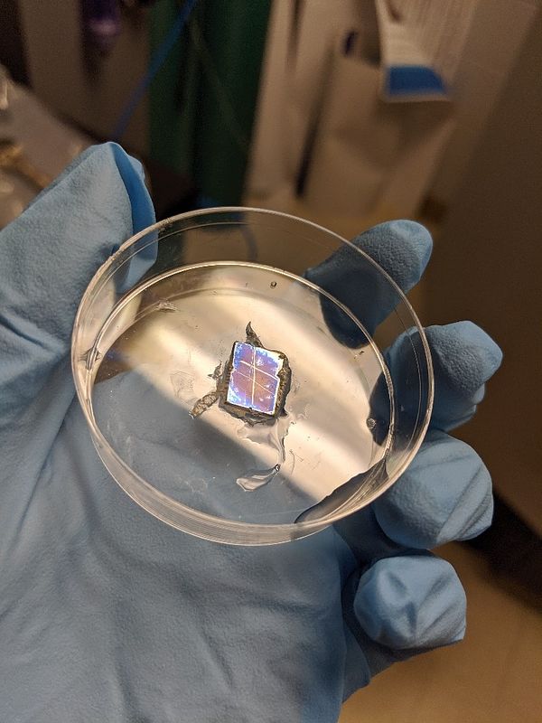 In the picture, the grey mud-like thing that you see surrounding the silica wafer is hardened epoxy glue. I used epoxy since a double-sided adhesive tape failed to keep the silica wafer in place over time (in aqeuous solution). This was an initial experiment...hence the overflow of epoxy!